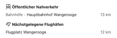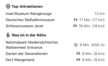 Beliebte Ausflugsziele wie das Deutsche Sielhafenmuseum (18 km) oder das Schlossmuseum Jever (20 km) sind schnell erreichbar. Der nächste Flughafen ist Bremen (114 km).